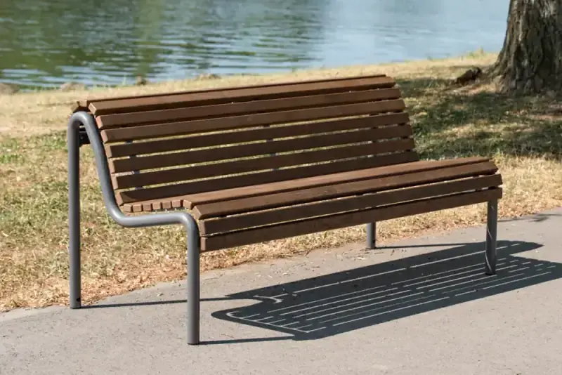 Profilbank mit Rückenlehne, anreihbar ohne Doppelfuß an der Verbindungsstelle.Körpergerecht geformte, durchgehende Sitzkörper aus fein geschliffenen Holzlatten, Enden gefast, auf federnde Lattenträger rückseitig verdeckt verschraubt.Untergestell aus Rohr Ø 42 mm in Edelstahl. Verschraubungen Edelstahl.